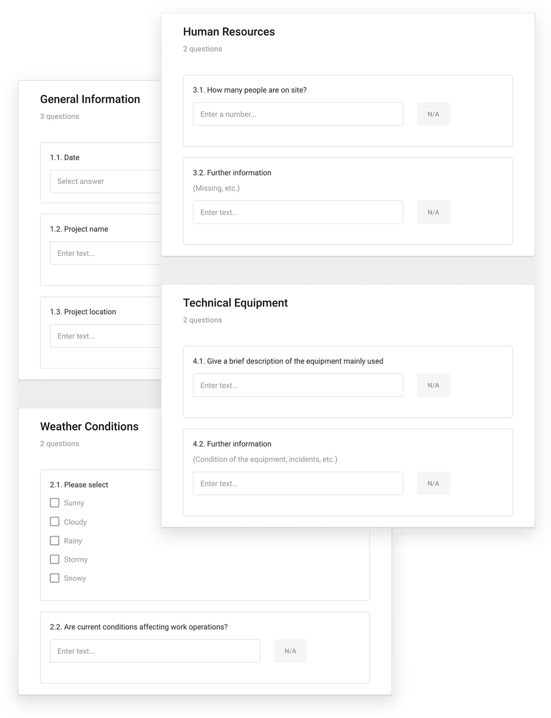 Mobile construction inspection checklist forms can help you outline your inspections into an easy checklist format, instantly generating inspection reports and even automating workflows based on the answers you provide on your inspection form. This allows you to communicate your inspection results in real time, making all your construction data always up to date and accurate wherever you or the rest of your team may be.